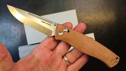 Real Steel Pathfinder Bushcraft Folding Knife Brown Micarta 14C28N (SCANDI GRIND) Plain Edge (OPEN BOX)