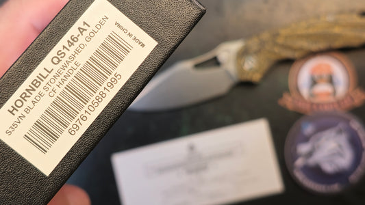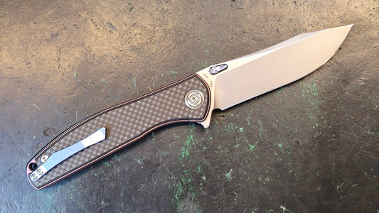 QSP Hornbill Front Flipper Knife 3.25" S35VN Stonewashed Drop Point Blade, Golden Carbon Fiber Handles, Liner Lock (OPEN BOX)