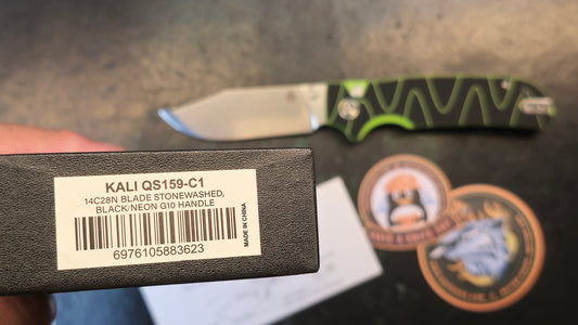 QSP Kali Button Lock Folding Knife 3.25" 14C28N Stonewashed Clip Point Blade, Black and Neon Green Milled G10 Handles (OPEN BOX)