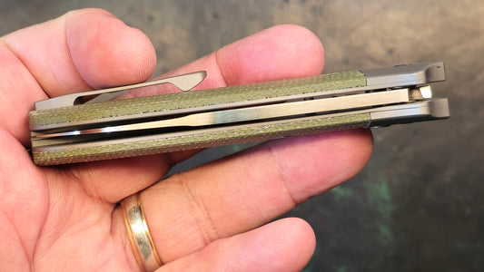 Rosecraft Clinch River Button Green Micarta M390 Wharncliffe Plain Edge Satin (CLOSEOUT)