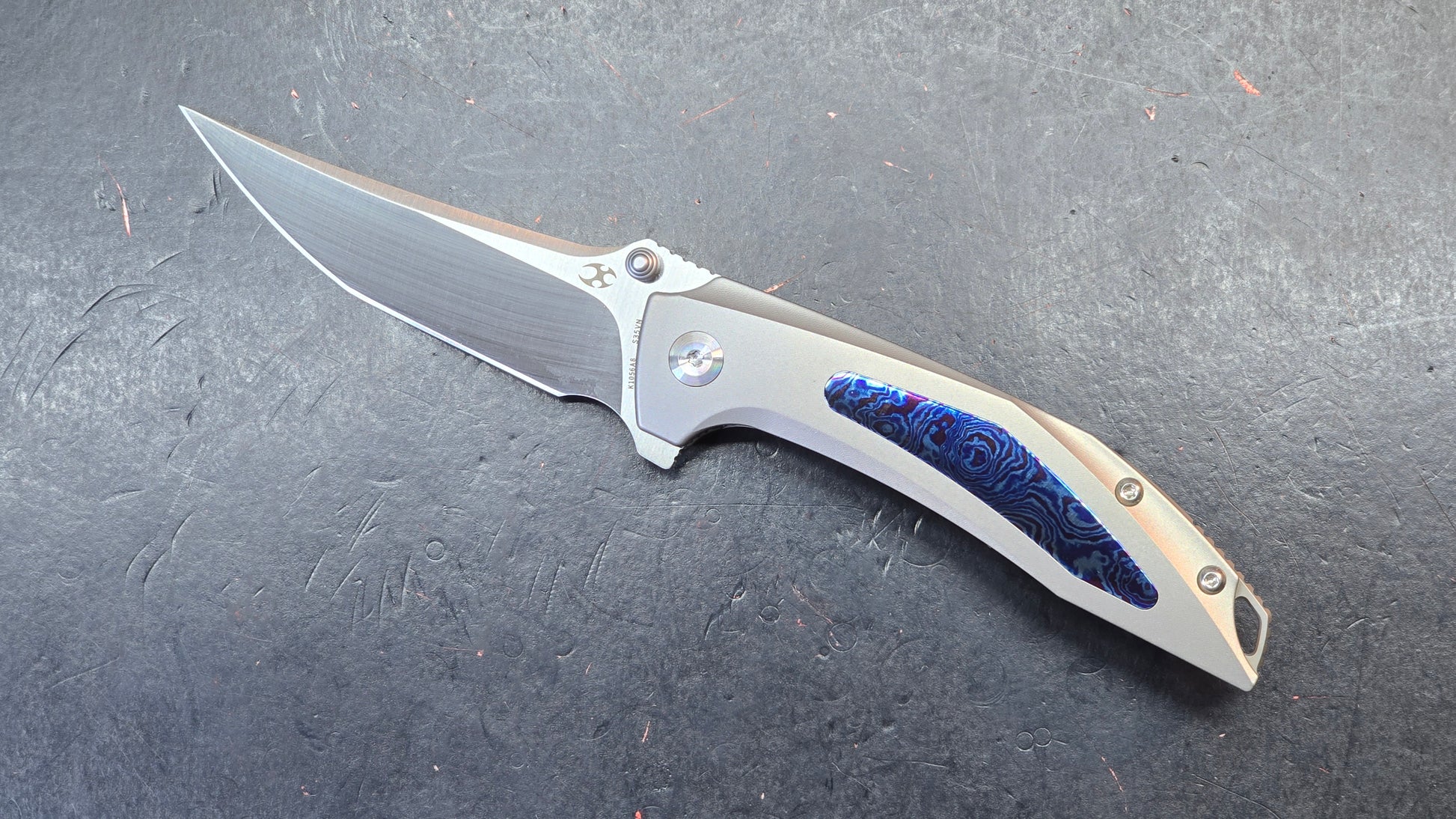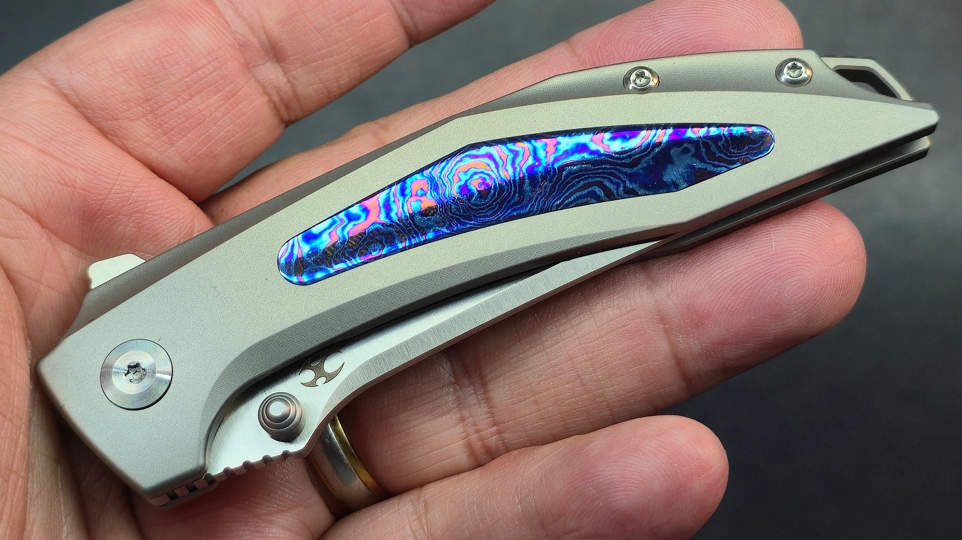 - Handle Material: Blasted Titanium with Timascus Inlay