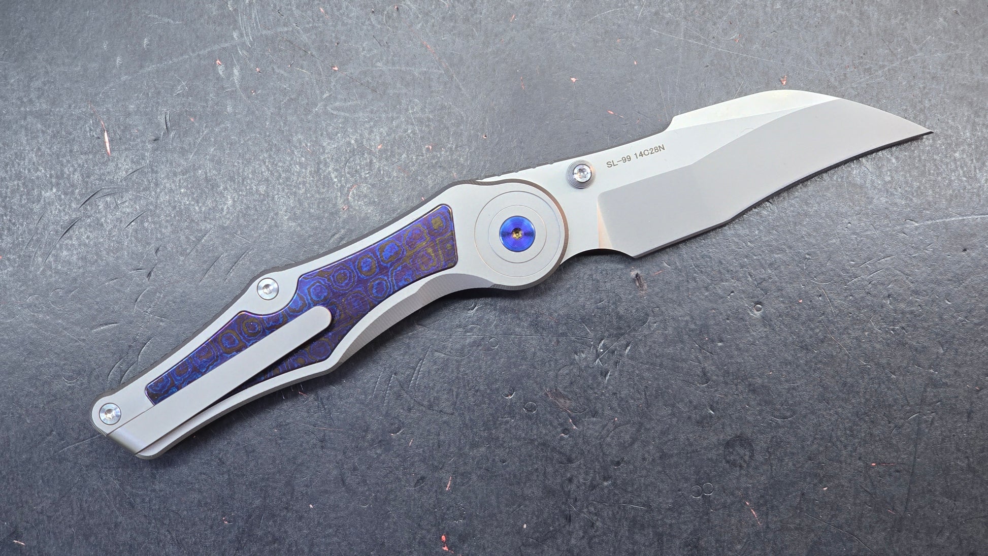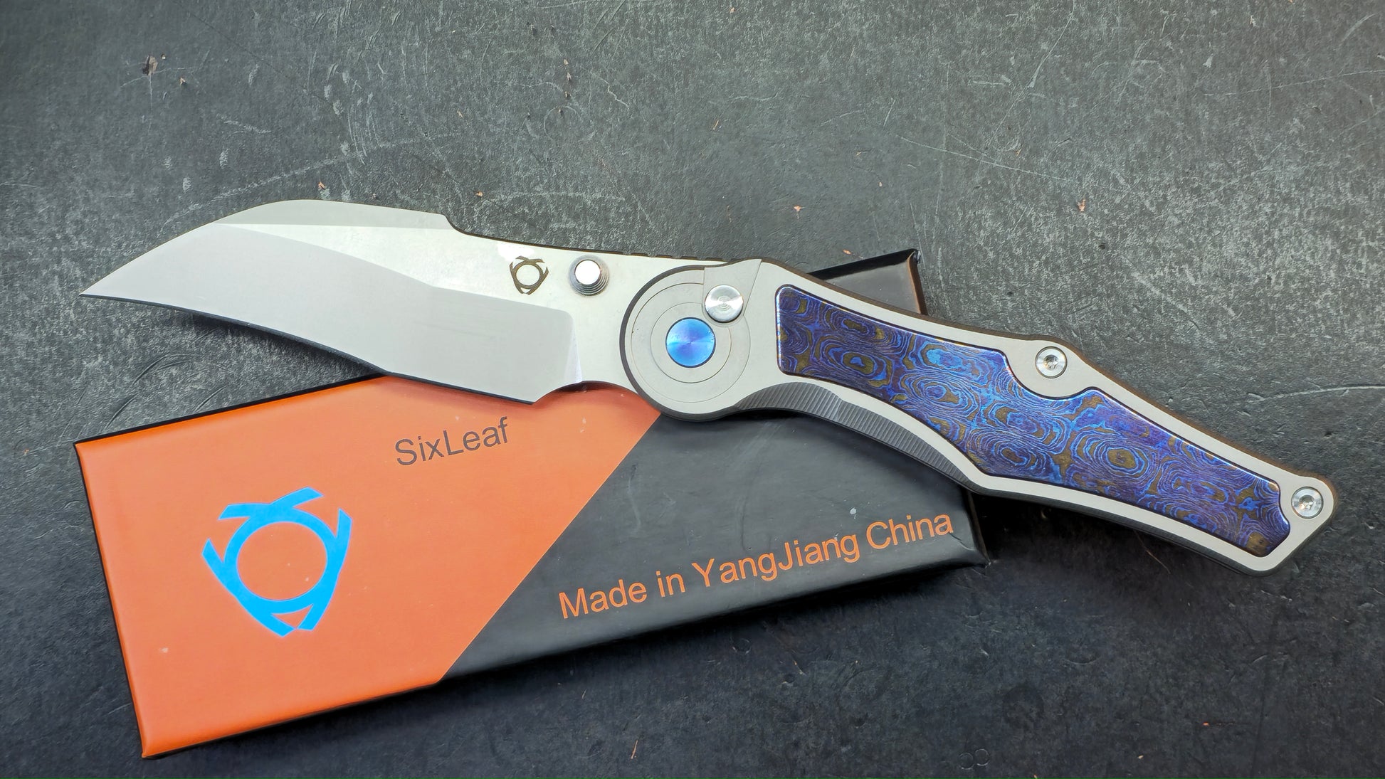 Sixleaf SL-99 Button Lock Blue Ano / TiDamascus 14C28N (SALE price in cart)